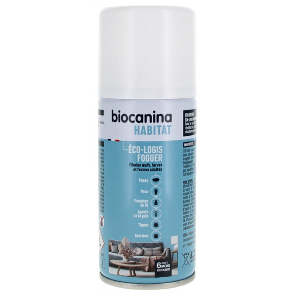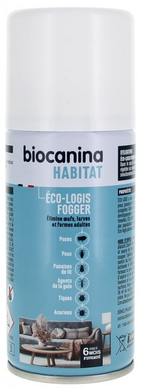 Éco-Logis Spray Habitat de Biocanina est un dispositif à utilisation unique pour traiter les pièces afin de luter contre les puces, les poux, les punaises de lit, les agents de la gale, les tiques et les acariens.