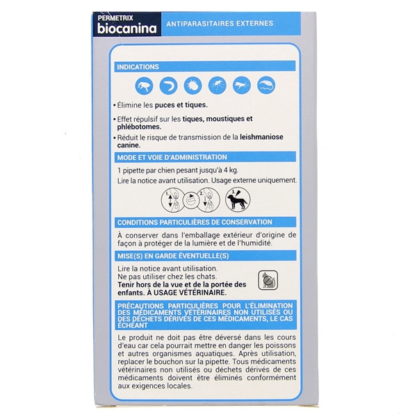 Évitez de mettre le Permetrix Très Petits Chiens en contact avec les yeux ou la gueule du chien. Il est déconseillé d’appliquer le dispositif Biocanina sur une peau lésée. Il n’est pas recommandé d’utiliser ce produit Biocanina chez les chiots de moins de 7 semaines ou pesant moins de 1,5 kg.