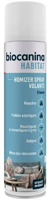 Homizer Spray Volants Habitat de Biocanina permet d'éliminer les insectes volants des habitations. Ce spray agit sur les mouches, les frelons asiatiques, les moustiques, les moustiques tigres, les guêpes et les mites des vêtements.