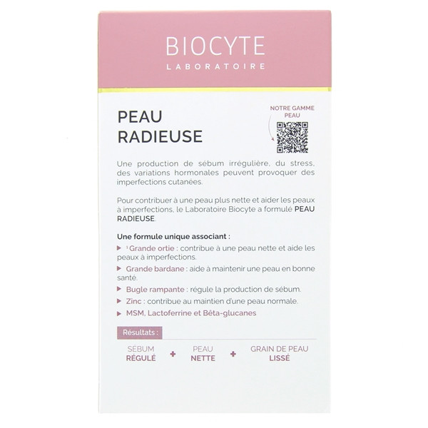 Biocyte Peau Radieuse est un complément alimentaire spécialement conçu pour aider et embellir les peaux à imperfections (production de sébum irrégulière, stress, variations hormonales...).