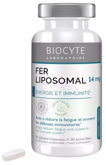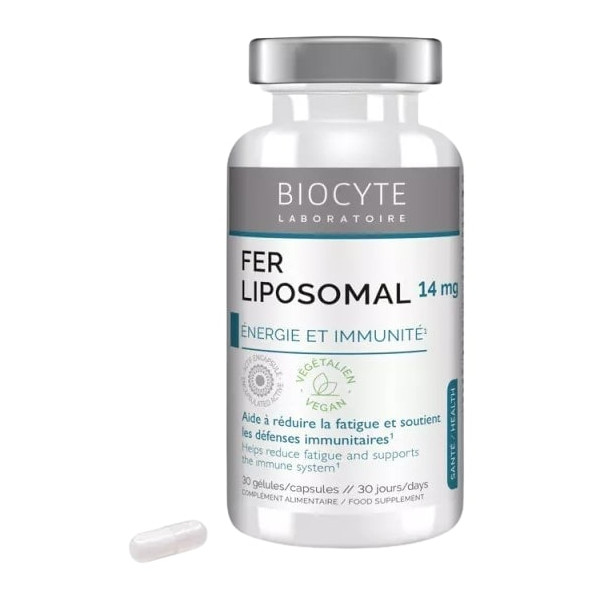 Les laboratoires Biocyte proposent Fer Liposomal 14 mg avec une association de fer, vitamines C et B12 qui contribue à réduire la fatigue. Le fer contribue à la formation normale de globules rouges et d'hémoglobine, et au fonctionnement normal du système immunitaire. La vitamine C accroît l'absorption de fer.