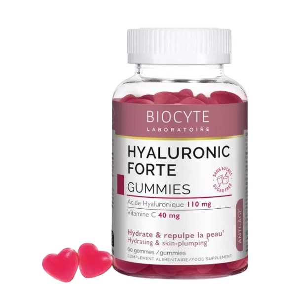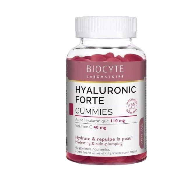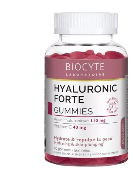 Biocyte Hyaluronic Forte Gummies est un complément alimentaire sans sucre formulé à base d'acide hyaluronique et de vitamine C. Il est indiqué pour contribuer à hydrater et repulper la peau.