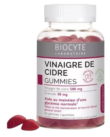 Le complément alimentaire Vinaigre de Cidre en Gummies du laboratoire Biocyte contient 500 mg de vinaigre de cidre et 50 mg de grenade.