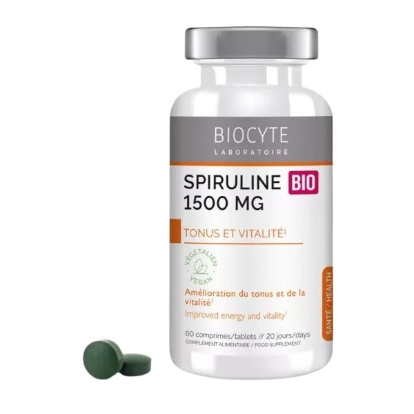 BiocyteSpiruline Bio 1500mg est un complément alimentaire indiqué pour améliorer le tonus et la vitalité.