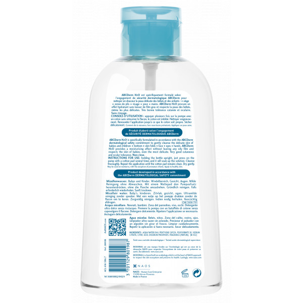 ABCDerm H2O Eau Micellaire est un nettoyant ultra-doux pour les peaux sensibles du siège, du visage et des yeux des enfants et des bébés.