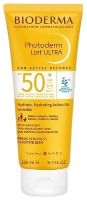 Bioderma Lait Ultra Photoderm SPF50+ combine les propriétés de filtres UV et d’une protection solaire biologique brevetée à la pointe de la technologie, la Sun Active Defense. Il est conçu pour améliorer les capacités d’auto-défense de la peau contre les impacts des rayons UVA/UVB. Préservant aussi contre le stress oxydatif et l’altération des cellules, ce produit contribue au maintien durable de la santé de la peau. Grâce à sa texture légère et fondante, ce lait pénètre rapidement le derme. Il est incolore à l’application et son fini est invisible, sans effet gras. Il résiste à l’eau, au sable, à la transpiration. Ce lait hydratant est disponible en tube souple de 200ml.
