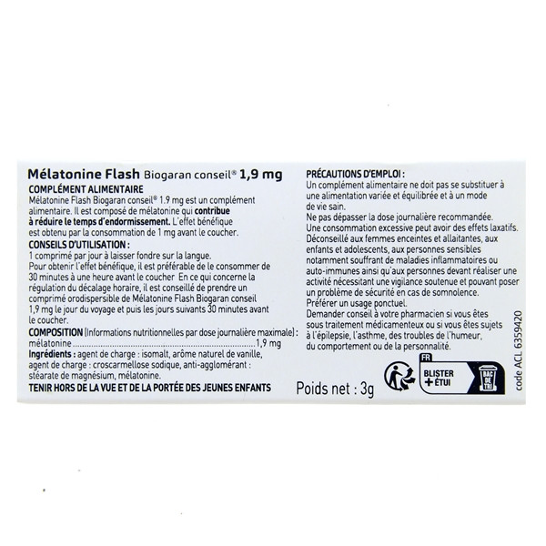 Melatonine Flash 1,9mg est un complément alimentaire pour les adultes du laboratoire Biogaran indiqué pour réduire le temps d'endormissement.