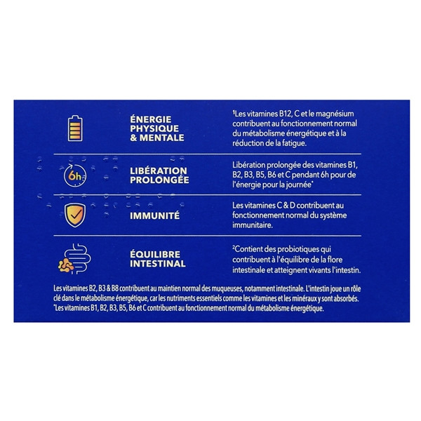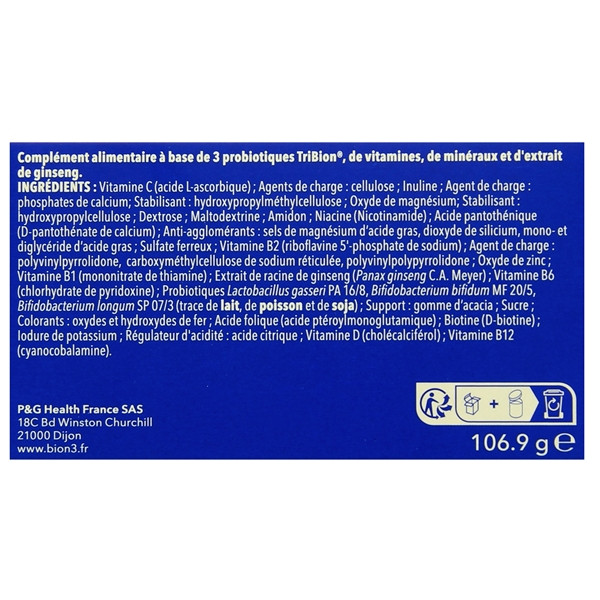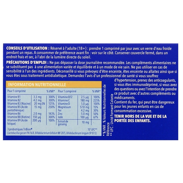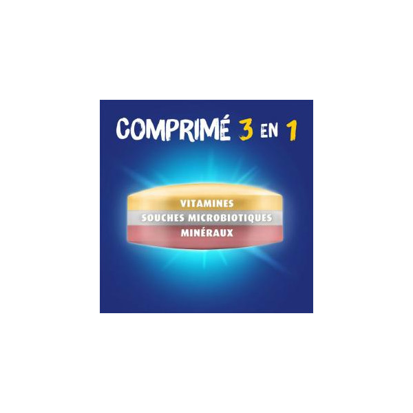 Acide L-ascorbique; Agents de charge: cellulose, phosphates de calcium; Inuline; Stabilisant: hydroxypropylméthylcellulose; Oxyde de magnésium; Stabilisant: hydroxypropylcellulose; Dextrose; Maltodextrine; Nicotinamide; D-pantothénate de calcium; Anti-agglomérants: sels de magnésium d’acide gras, dioxyde de silicium, talc; Sulfate ferreux; Dextrine; Support: carbonate de calcium; Amidon; Riboflavine 5'-phosphate de sodium; Oxyde de zinc; Agents de charge: polyvinylpolypyrrolidone, carboxyméthylcellulose de sodium réticulée; Mononitrate de thiamine; Extrait de racine de ginseng (Panax ginseng C.A. Meyer); Chlorhydrate de pyridoxine; Cultures microbiotiques Lactobacillus gasseri PA 16/8, Bifidobacterium bifidum MF 20/5, Bifidobacterium longum SP 07/3 (trace de lait, de poisson et de soja); Support: gomme d’acacia; Sucre; Colorants: oxydes et hydroxydes de fer; Acide ptéroylmonoglutamique (acide folique); D-biotine; Iodure de potassium; Régulateur d'acidité: acide citrique; Cholécalciférol; Cyanocobalamine.