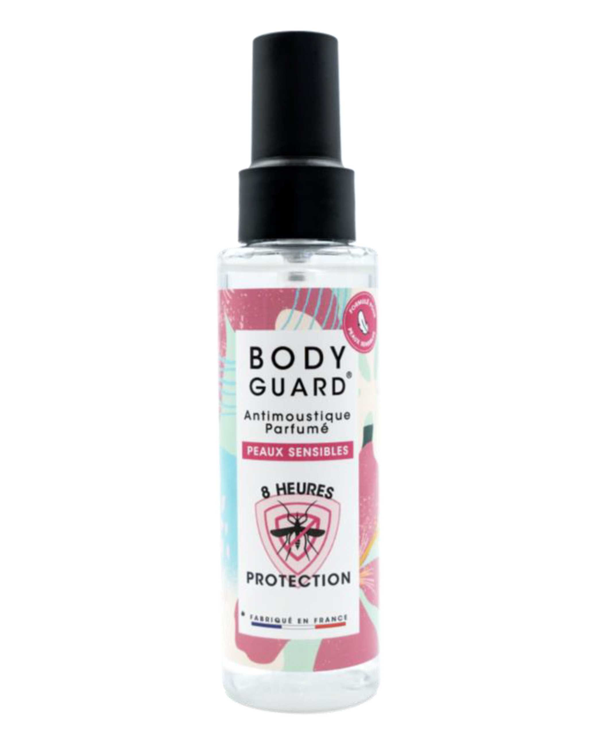 Bodyguard Anti-moustiques Parfumé Peaux Sensibles est un spray léger et doux, spécialement formulé pour les peaux sensibles (enfants dès 3 mois, femmes enceintes et séniors), avec un parfum subtil et mixte de pétales de lotus. Il protège jusqu'à 8 h contre les moustiques et 6 h contre les tiques.