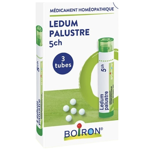 Ledum Palustre 5 CH Granules Boiron est un médicament homéopathique indiqué pour calmer les démangeaisons, soulager la douleur des piqûres d'insectes et traiter l'ecchymose post-traumatique.