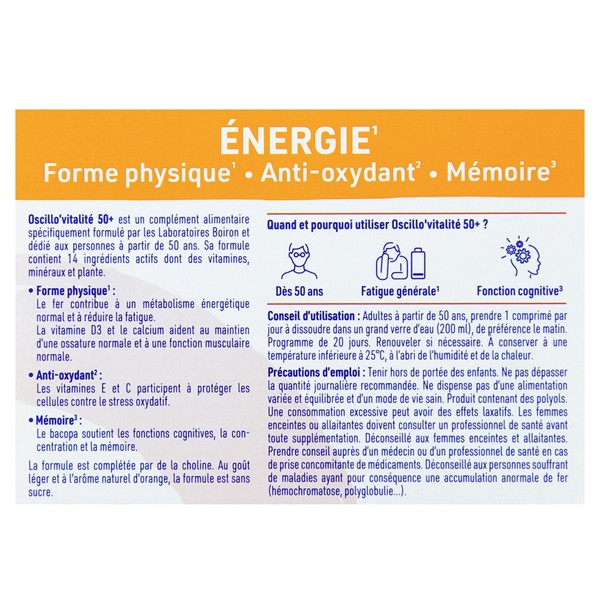 Oscillo Vitalité Adultes 50+ du laboratoire Boiron est un complément alimentaire pour les adultes à partir de 50 ans. Il contribue à un métabolisme énergétique normal, au maintien d'une ossature normale et au soutien des fonctions cognitives, de la mémoire et de la concentration.