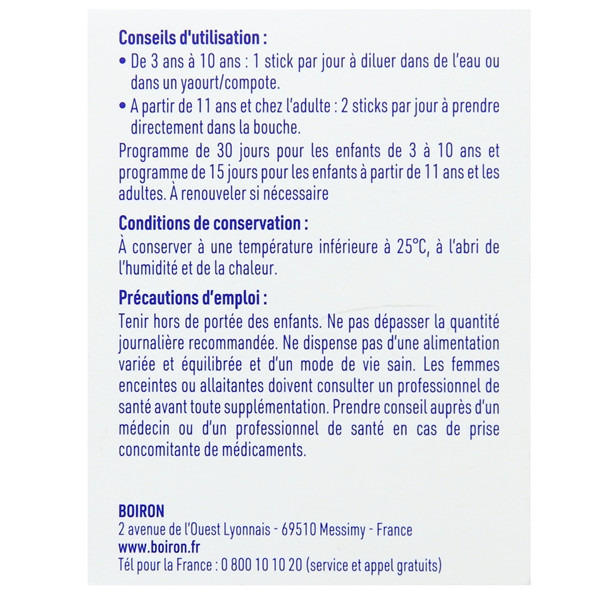 - Enfant de 3 à 10 ans : 1 stick par jour, à diluer dans un verre d’eau, de yaourt ou de compote.