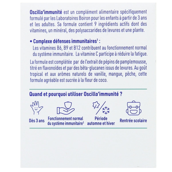Oscillo Immunité Enfants du laboratoire Boiron est un complément alimentaire indiqué pour contribuer au fonctionnement normal du système immunitaire. Il est particulièrement recommandé lors de la période de l'automne et de l'hiver, ainsi que lors de la rentrée scolaire.