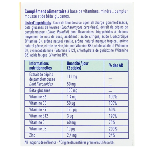 Sucre de fleur de coco, agent de charge : gomme d’acacia, bêta-glucanes de levures (Saccharomyces cerevisiae), extrait de pépins de pamplemousse (Citrus paradisi) dont flavonoïdes, triglycérides à chaînes moyennes de noix de coco, acidifiant : acide citrique, acide L-ascorbique (vitamine C), arôme naturel vanille, arôme naturel mangue tropical, arôme naturel pêche, citrate de zinc, biotine (vitamine B8), cholécalciférol (vitamine D), cyanocobalamine (vitamine B12), chlorhydrate de pyridoxine (vitamine B6), acide folique (vitamine B9).