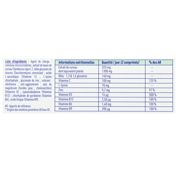 Agent de charge : cellulose microcristalline ; extrait de baies de sureau (Sambucus nigra L.) ; bêta glucanes de levures (Saccharomyces cerevisiae) ; acide L-ascorbique (vitamine C) ; L-lysine chlorhydrate ; gluconate de zinc ; colorant : riboflavine ; anti-agglomérant : sels de magnésium d’acides gras ; cholécalciférol (vitamine D) ; cyanocobalamine (vitamine B12) ; chlorhydrate de pyridoxine (vitamine B6) ; acide folique (vitamine B9).
