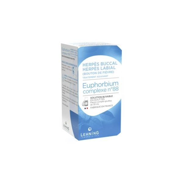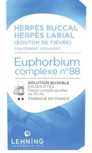 Les gouttes buvables Euphorbium ou complexe Lehning n° 88 est un médicament homéopathique traditionnellement utilisé dans les affections cutanées vésiculaires c'est-à-dire en complément des autres traitements médicamenteux en cas d'herpès labial ou bouton de fièvre.