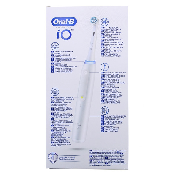 La brosse à dent électrique iO 5 Nettoyage, Protection & Aide au Brossage Professionnels est vendue dans une boîte comprenant aussi un chargeur et deux brossettes (1 Gentle Care et 1 Specialised Clean).