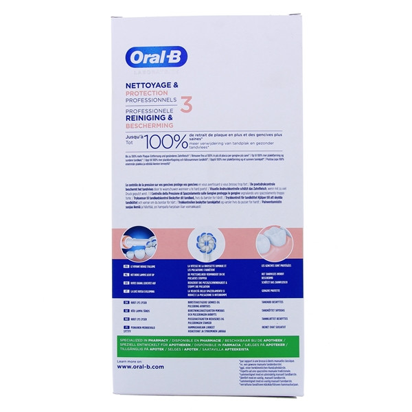 La brosse à dents électrique Nettoyage & Protection Professionnels 3 Oral-B nettoie efficacement et en douceur grâce à ses poils ultra-fins. Brosse à dent électrique à tête ronde, elle vous permettra d'atteindre des zones d'accès difficiles. Un minuteur intégré de 2 minutes vous permettra de respecter le temps de brossage recommandés par les dentistes. Cette brosse à dents dispose d'un indicateur lumineux de pression lorsque la pression est trop forte sur les gencives, permettant ainsi de garantir la protection de vos gencives. La batterie Li-ON assure jusqu'à 2 semaine de brossage avec une charge complète.