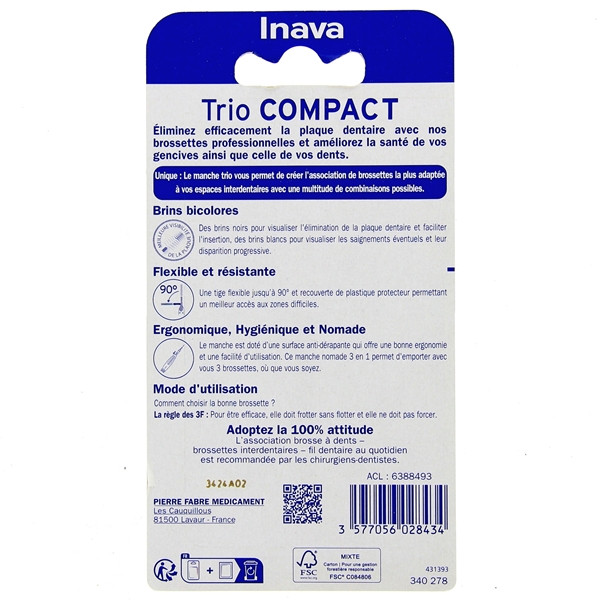 Les Brossettes Interdentaires 4/4/4 Trio Compact sont fabriquées en France par la marque Inava qui propose une vaste gamme de produits pour l’hygiène bucco-dentaire afin de répondre aux besoins de chaque utilisateur.