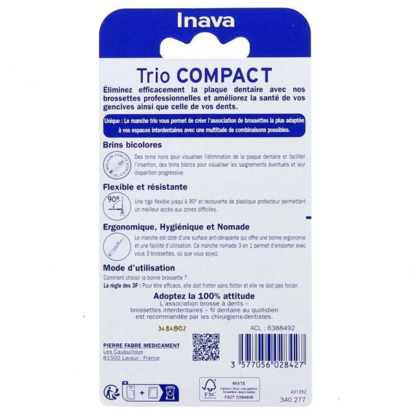 Les Brossettes Interdentaires Trio Compact de la marque Inava sont indiquées pour nettoyer efficacement les espaces interdentaires de différentes tailles grâce à un système 3 en 1.