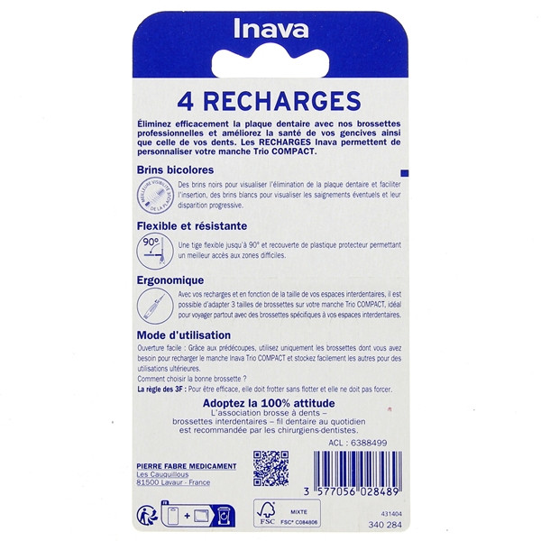 Les Recharges Brossettes Interdentaires Trio Compact Rouge sont fabriquées en France par Inava qui propose 6 différentes tailles de brossettes, de 0,6mm à 1,8mm, pour s’adapter à la particularité de chaque dentition.