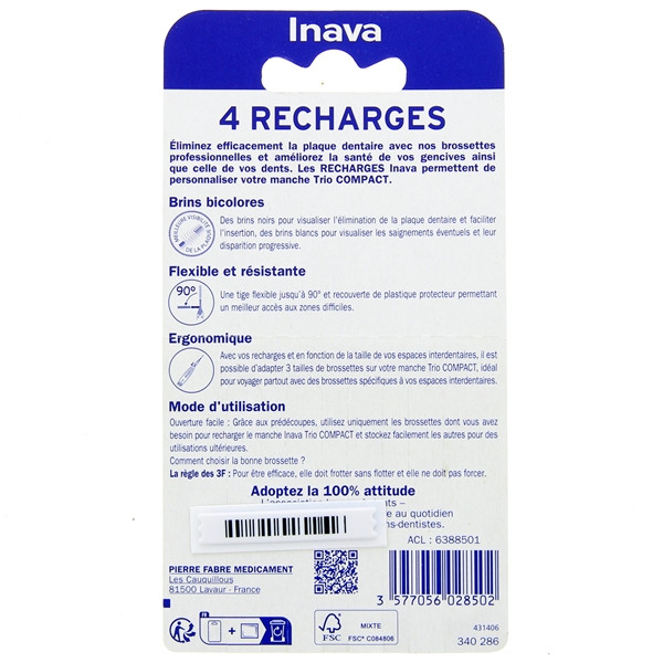 Inava Recharges Brossettes Trio Compact Vert sont nanties de brins souples qui respectent les gencives et l’émail des dents. Les brins noirs simplifient leur insertion dans les zones difficiles d’accès et aident à constater l’élimination de la plaque. Les brins blancs sont plus épais dans l'objectif de parfaire le brossage et de déceler d’éventuelles irritations gingivales signalées par des saignements. La solidité de leur tige métallique garantit leur sécurité d’utilisation. Ces dispositifs sont élaborés pour s’adapter aux manches de brossettes Inava Flex et Trio Compact afin de permettre aux usagers d’optimiser leur hygiène bucco-dentaire. Ils éliminent les résidus d’aliments et la plaque dentaire localisés entre les dents et prémunissent contre les maladies parodontales et la formation de caries. Ces accessoires sont conseillés pour préserver la santé des dents. Conditionnement : 4 brossettes de recharge.