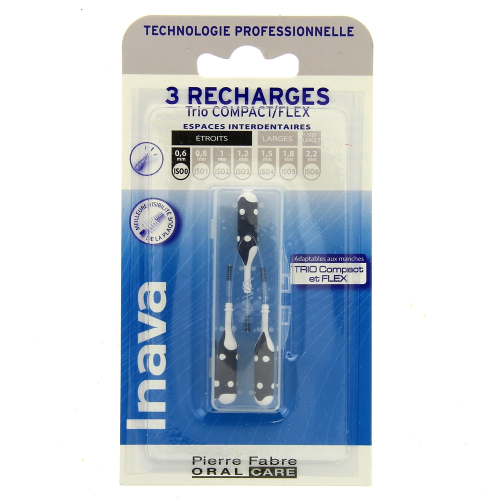 Les recharges inter-dentaires de la marque Inava sont conçues pour garantir une hygiène dentaire durable. Elles sont adaptées pour les manches Inava Compact et Inava Flex et déclinées en 6 tailles de différentes largeurs et couleurs. Disponible par 3 sous blister pour les espaces interdentaires de 0,6mm (ISO 0).