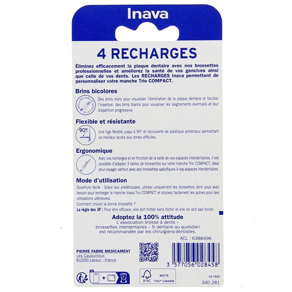 Les recharges brossettes interdentaires de la marque Inava sont adaptées pour les manches Inava Trio Compact. Elles assurent un nettoyage simple et efficace des espaces interdentaires afin d'éliminer tous les résidus alimentaires et la plaque dentaire.