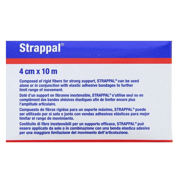 Strappal Bande de Contention Adhésive Rigide 4cmx10m de BSN-Radiante est un dispositif collant non élastique indiqué dans différents domaines. Elle s’utilise en traumatologie sportive, en orthopédie, pour une contention ferme des articulations, etc.