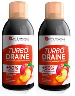La boisson Turbo Draine au goût de thé vert - pêche des laboratoires Forté Pharma est conçue spécialement pour brûler les calories, drainer et purifier l'organisme. Grâce aux propriétés drainantes de la queue de Cerise, l'Hibiscus, le Cactinéa et la Reine des prés, elle élimine efficacement l'eau. Le Thé vert contribue à brûler les graisses tout en stimulant la dégradation au niveau des lipides. Le Ginseng, l'Algue Aosa et la Goyave apportent les ions et les minéraux à l'organisme. La boisson Turbo Draine a un goût agréable et dégage un doux parfum fruité.
