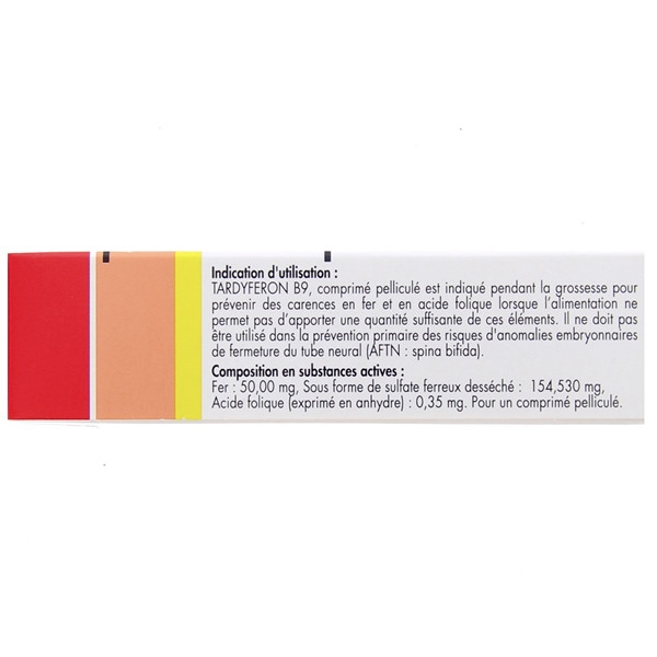Tardyferon B9 est disponible en boîte de 30 comprimés pelliculés.