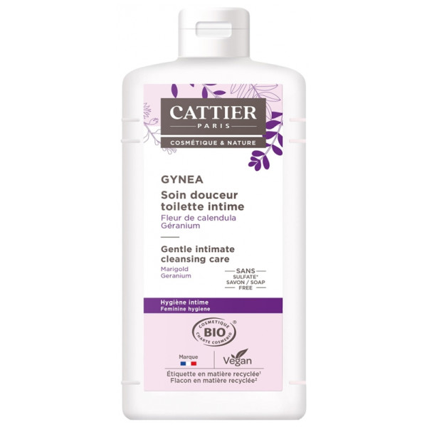 Gynea Soin Douceur Toilette Intime Bio en flacon de 200ml est fabriqué en France par la marque Cattier. Depuis sa création en 1968, cette enseigne s’engage à privilégier des ingrédients issus de l’Agriculture biologique.