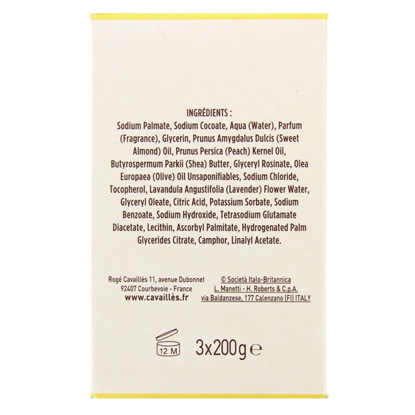 Sodium Palmate, Sodium Cocoate, Aqua (Water), Glycerin, Parfum (Fragrance), Prunus Amygdalus Dulcis (Sweet Almond) Oil, Prunus Persica (Peach) Kernel Oil, Butyrospermum Parkii (Shea) Butter, Glyceryl Rosinate, Olea Europaea (Olive) Oil Unsaponifiables, Sodium Chloride, Tocopherol, Lavandula Angustifolia (Lavender) Flower Water, Glyceryl Oleate, Citric Acid, Potassium Sorbate, Sodium Benzoate, Sodium Hydroxide, Tetrasodium Glutamate Diacetate, Lecithin, Ascorbyl Palmitate, Hydrogenated Palm Glycerides Citrate, Camphor, Linalyl Acetate.