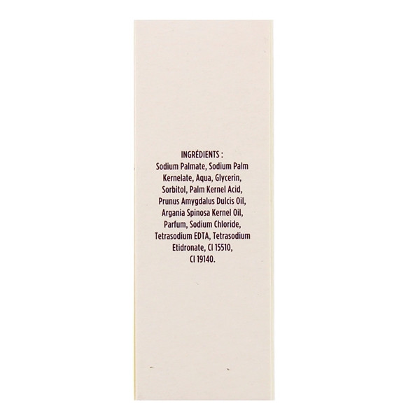 Sodium Palmate, Sodium Palm Kernelate, Aqua, Glycerin, Sorbitol, Palm Kernel Acid, Argania Spinosa Kernel Oil, Parfum, Potassium Palmate, Prunus Amygdalus Dulcis Oil, Potassium Palm Kernelate, Propylene Glycol, Sodium Chloride, Pentasodium Pentetate, Tetrasodium EDTA, Tetrasodium, Etidronate, CI 15510, CI 19140.
