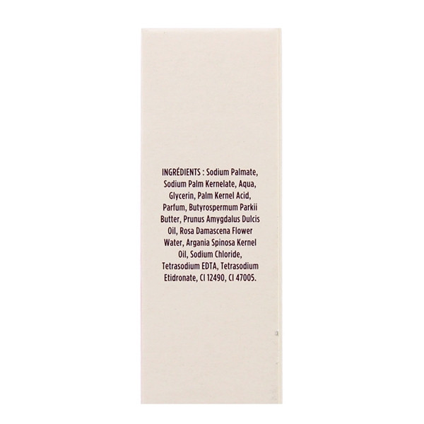 Sodium Palmate, Sodium Palm Kernelate, Aqua, Glycerin, Palm Kernel Acid, Parfum, Butyrospermum Parkii Butter, Prunus Amygdalus Dulcis Oil, Rosa Damascena Flower Water, Argania Spinosa Kernel Oil, PPG-5-Ceteth-20, Sodium Chloride, Tetrasodium EDTA, Tetrasodium Etidronate, CI 12490, CI 47005.