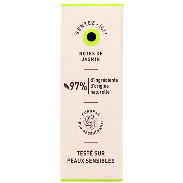Grâce à sa formule qui nettoie en douceur, ce savon offre un moment de bien-être pendant son utilisation. Doté d’une mousse légère et enveloppante, il dégage un parfum fleuri et éclatant de jasmin. Ce dernier se marie parfaitement avec des notes de fleurs d’agrumes. Composé à 97 % d’ingrédients d’origine naturelle, il contient de :