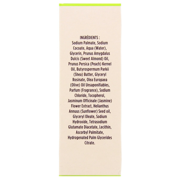 Sodium Palmate, Sodium Cocoate, Aqua (Water), Glycerin, Prunus Amygdalus Dulcis (Sweet Almond) Oil, Prunus Persica (Peach) Kernel Oil, Butyrospermum Parkii (Shea) Butter, Glyceryl Rosinate, Olea Europaea (Olive) Oil Unsaponifiables, Parfum (Fragrance), Sodium Chloride, Tocopherol, Jasminum Officinale (Jasmine) Flower Extract, Helianthus Annuus (Sunflower) Seed Oil, Glyceryl Oleate, Sodium Hydroxide, Tetrasodium Glutamate Diacetate, Lecithin, Ascorbyl Palmitate, Hydrogenated Palm Glycerides Citrate.