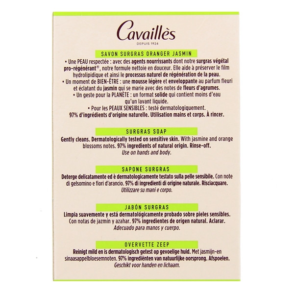 Le Savon Surgras Oranger Jasmin de Cavaillès nettoie tout en douceur la peau du corps et des mains en respectant l'intégrité cutanée. Il est adapté aux peaux sensibles.