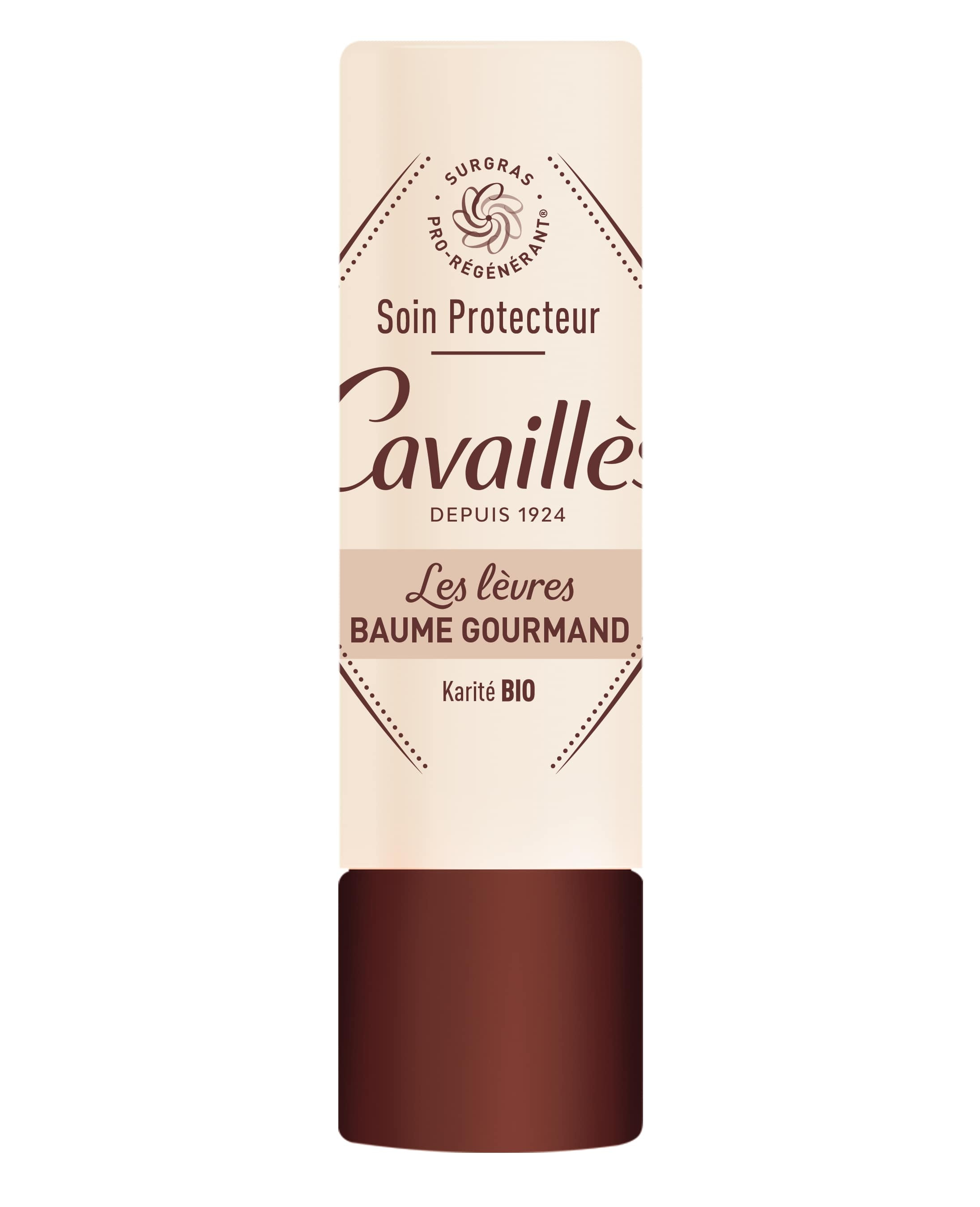 Le Baume Lèvres Gourmand Protecteur de Cavaillès est enrichi en surgras végétal pro-régénérant et en beurre de karité bio pour réparer et protéger les lèvres sèches. Il offre une agréable texture fondante et un parfum délicat.