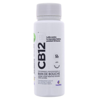 CB12 White Bain de bouche sans alcool avec un arôme léger de menthe poivrée est indiqué pour lutter contre la mauvaise haleine pendant 12 h. De plus, il contient un effet blanchisseur visible dès 2 semaines.