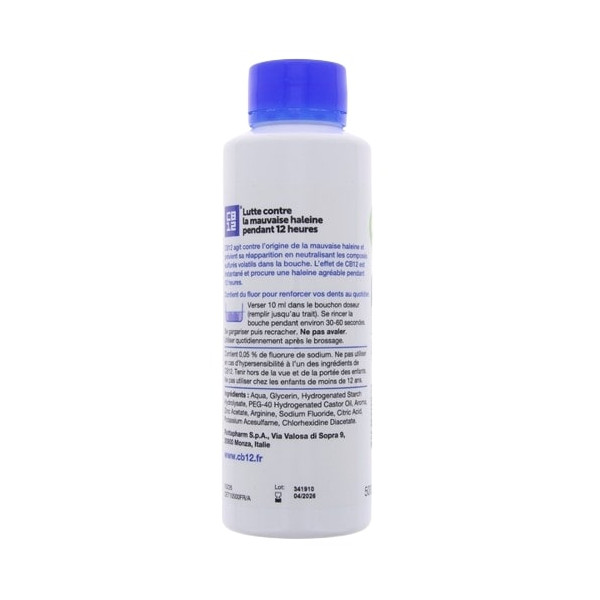 CB12 prévient et traite la mauvaise haleine (halitose) en éliminant les composés sulfurés volatils dans la bouche. L'effet de ce bain de bouche est immédiat et procure une haleine saine et fraîche pendant une journée (soit 12 heures).