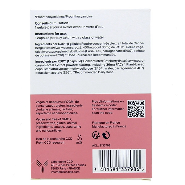 Poudre concentrée d'extrait total de canneberge (Vaccinium macrocarpon) : 400 mg dont 36 mg de PACs. Gélule végétale : Hydroxypropylméthylcellulose (E464), Eau, Carraghénane (E407), Acétate de potassium (E261).