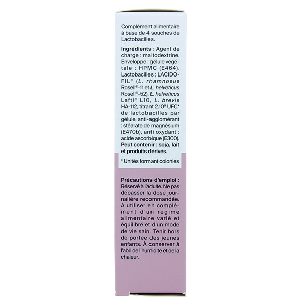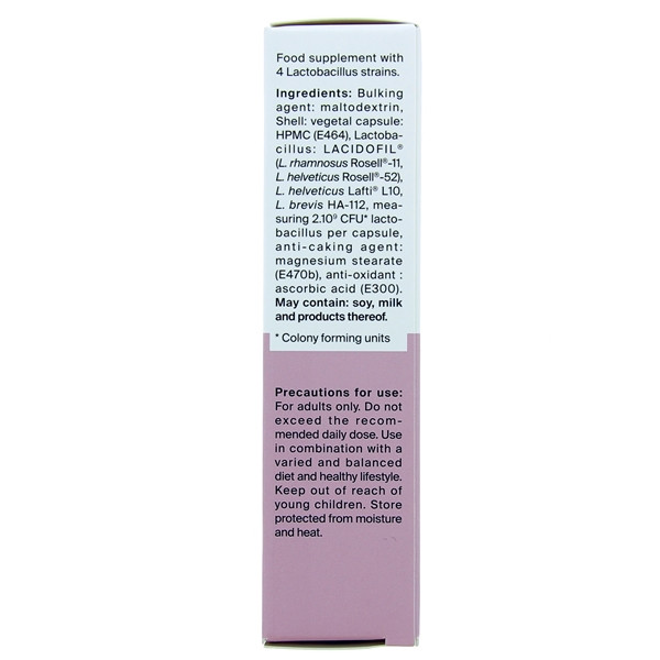 Agent de charge : maltodextrine, Enveloppe : gélule végétale HPMC (E464), Lactobacilles : LACIDOFIL (L. rhamnosus Rosell -11 et L. helveticus Rosell -52), L. helveticus Lafti L10, L. brevis HA-112, titrant 2.109 UFC* de lactobacilles par gélule, anti-agglomérant : stéarate de magnésium (E470b), anti-oxydant : acide ascorbique (E300).