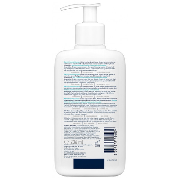 La formule de CeraVe Gel Moussant Anti-Imperfections contient de l’acide salicylique et 3 céramides essentiels (1, 3, 6-II) qui exfolient la peau en douceur, désincrustent les pores, favorisent la régénération cellulaire et contribuent à la réparation de la barrière cutanée. À ces ingrédients s’ajoute de l’argile blanche qui élimine les impuretés, telles que les boutons, les pustules et atténue la brillance du visage. Les bienfaits de ce constituant sont renforcés par la Technologie Sébum Contrôle qui absorbe l’excès de sébum et matifie le teint. La niacinamide et l’acide hyaluronique complètent la composition pour soulager les sensations d’irritation, diminuer les rougeurs et maintenir l’hydratation. Ce soin ne contient ni alcool, ni parfum. Conditionnement : flacon-pompe 236ml.