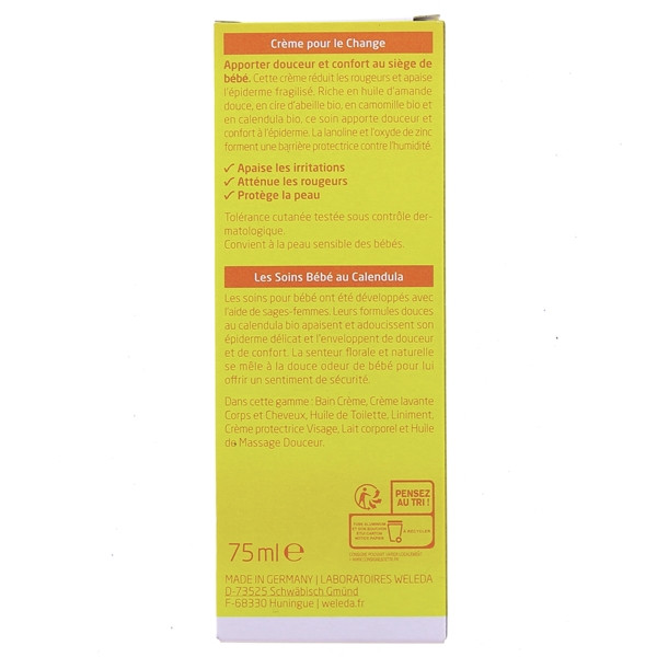 L'association extrait de Camomille bio, fleurs de Calendula, huiles de sésame, huile d'amande douce et cire d'abeille bio permet à la crème pour le change des bébés et des enfants de la marque Weleda de réduire les rougeurs tout en protégeant la peau sensible du nourrisson pendant le change.