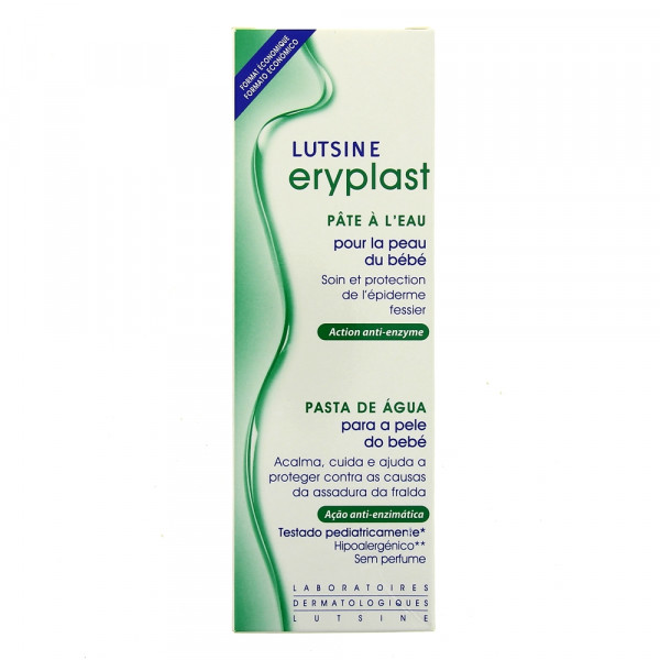 Pâte à l'eau pour favoriser la prévention et la protection des ROUGEURS et des érythèmes de l'épiderme fessier et pour les peaux sensibles du BEBE. La pâte à l'eau Lutsine Eryplast est disponible en tube de 200 grammes.
