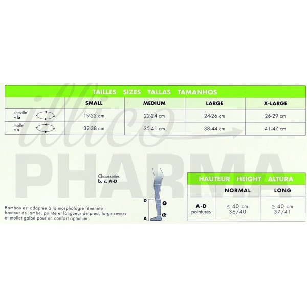 La gamme Bambou de Sigvaris est fabriquée à partir de polyamide microfibre, de viscose de bambou et d’élasthanne. La viscose de bambou apporte du moelleux à ces chaussettes très appréciées pour leur confort.