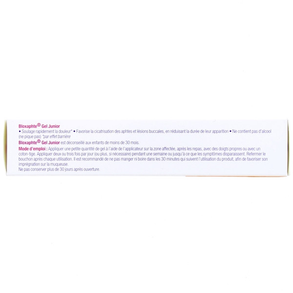 Bausch + Lomb Gel Junior Bloxaphte est un dispositif médical indiqué pour les enfants qui sont affectés par des aphtes uniques, multiples ou récidivants. Ce gel s’avère aussi efficace pour traiter les lésions buccales causées par une morsure accidentelle, une chute, le port d’un appareil dentaire ou soigner les ulcérations buccales dues à la varicelle. Il peut également être utilisé en cas de lésions de la lèvre ou de la gencive. Grâce à sa formule qui contient de l’acide hyaluronique et de la pectine, des substances qui exercent un effet barrière, ce produit réduit presque instantanément la douleur dès son application. Il favorise la guérison en diminuant le nombre des aphtes et en cicatrisant les lésions buccales.