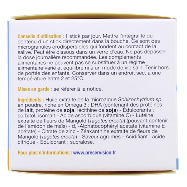 Preservision 3 sticks embarque une innovation galénique qui se présente sous forme de microgranulés orodispersibles. Écologique, ce complément alimentaire est formulé sans huile de poisson. Sa composition renferme également des omégas-3 issus des microalgues qui sont une source renouvelable et durable de DHA.