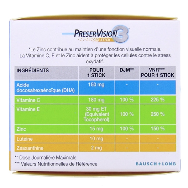 Preservision 3 sticks est un complément alimentaire à visée oculaire conçu par le laboratoire pharmaceutique Bausch & Lomb. Expert en ophtalmologie, cet établissement s’est spécialisé dans le développement de produits innovants. Ceux-ci répondent notamment à des besoins de professionnels de santé afin d’améliorer la vue des patients.